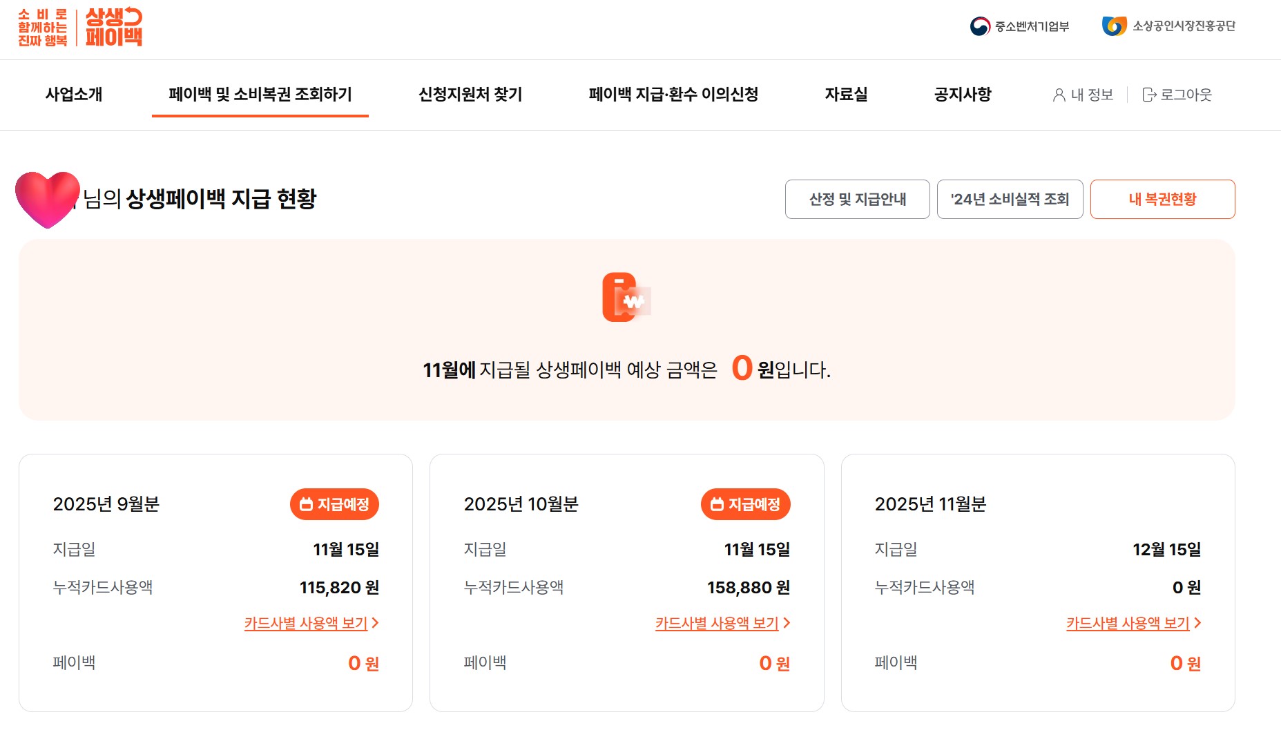 * 아래는 실제 제 상생페이백 지급 현황입니다.(11월3일자/ 지급액 0원)